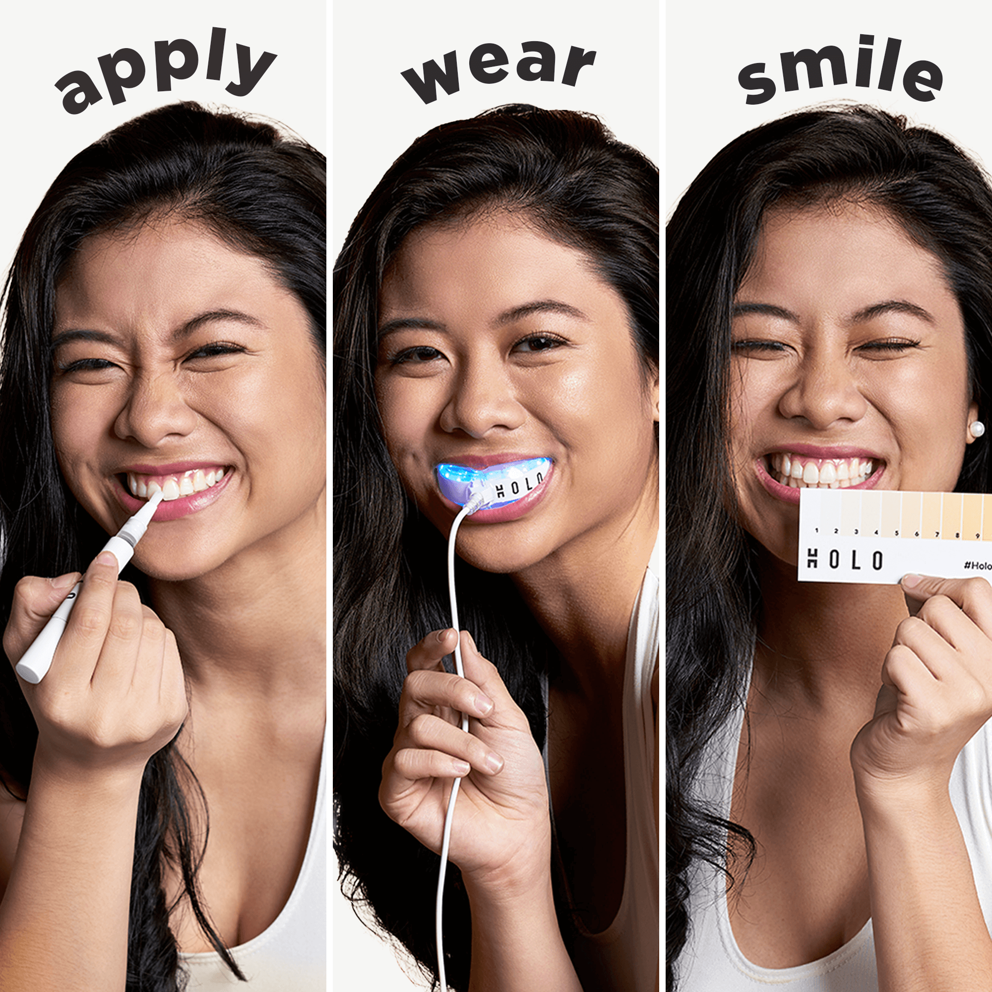 No cheap tricks, no shady, ineffective products. The Holo Kit uses the same active ingredient dentists use for teeth whitening to deliver professional results.